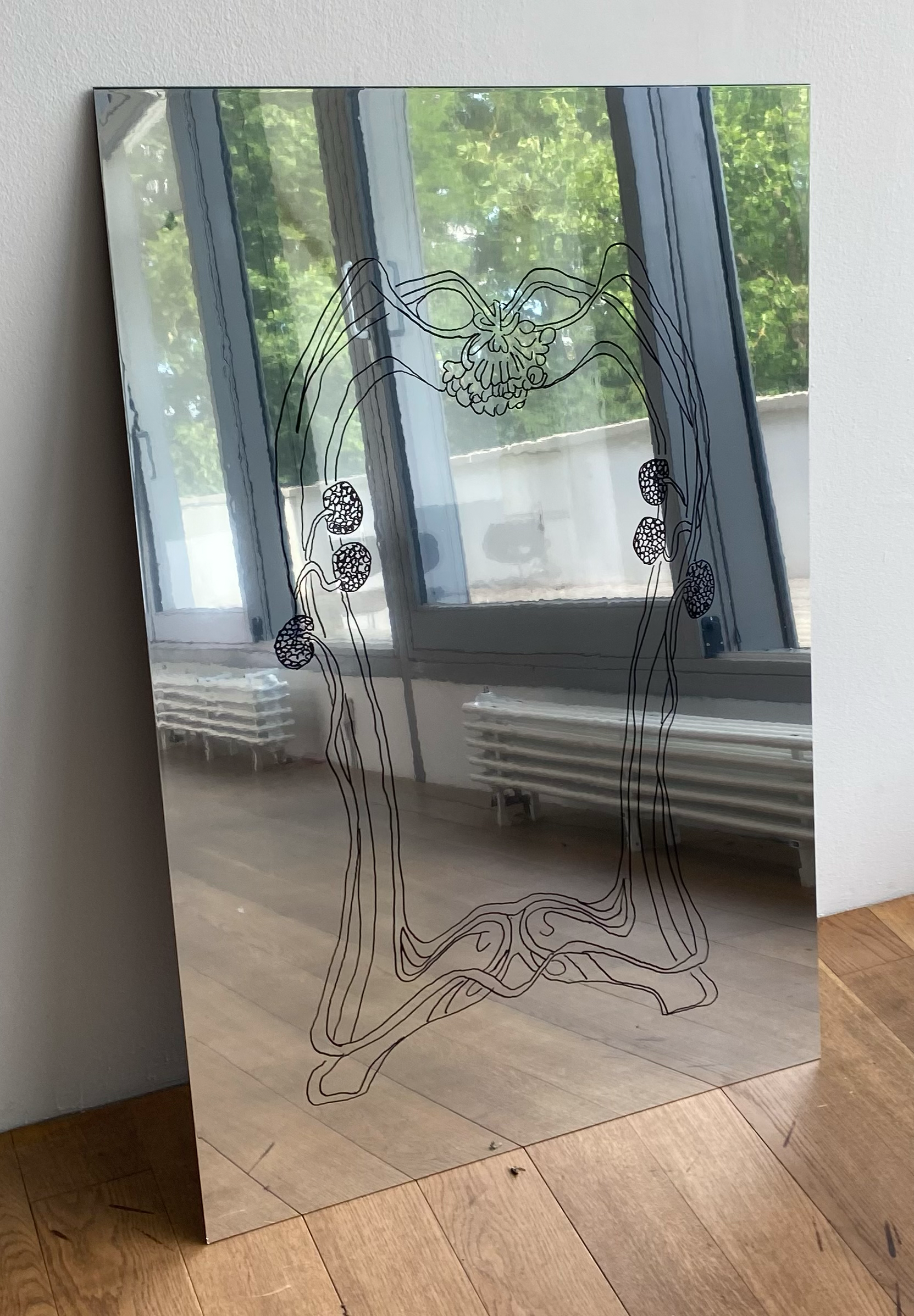 Trompe L’Œuf / 2025 / 125 x 83 cm / permanent marker on chromed aluminum